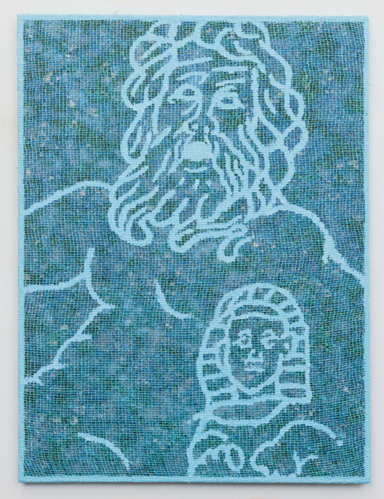 Herakles Seated on a Rock. Oil on canvas with mixed media collage; 60 x 48 inches; 2024.