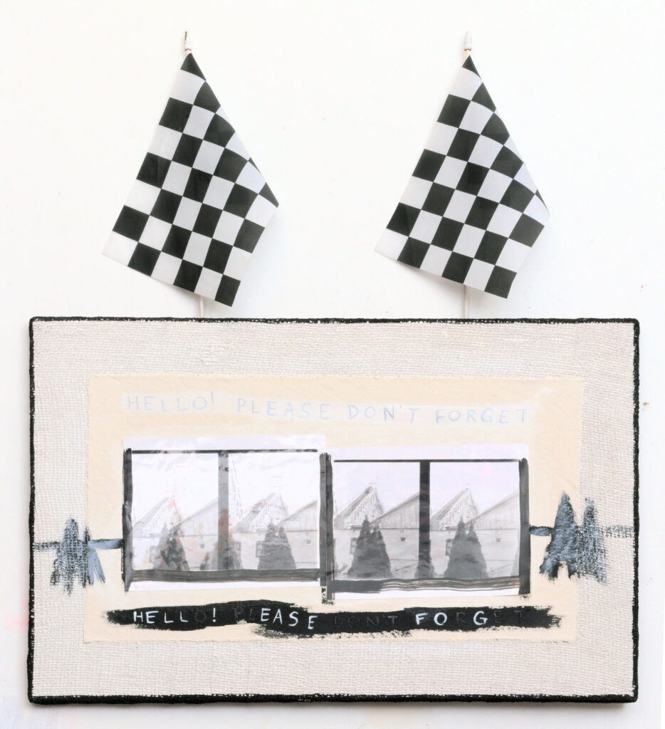 Life is a Rollercoaster (The Cyclone). India ink with silver gelatin prints on canvas with burlap, checkered flags; 36 x 30 inches; 2024.
