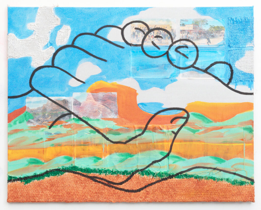 The Deal (with Maynard Dixon). Oil on canvas with burlap and assorted postcards from the American Southwest; 24 x 30 inches; 2024.