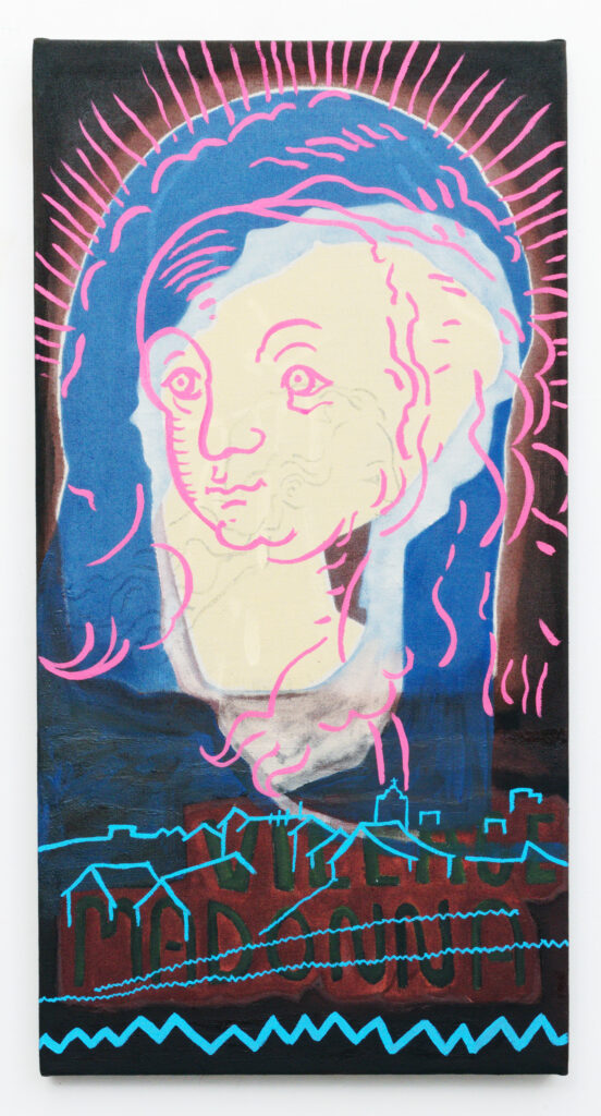 Village Madonna (with Dürer, Duccio, and Unknown Italian Master). Oil on canvas with burlap and mixed media collage; 36 x 18 inches; 2024.