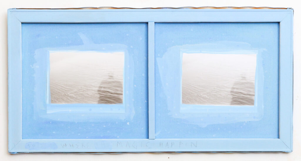 Where Magic Happen. Oil on found painting with silver gelatin prints; 18 x 36 inches; 2024.